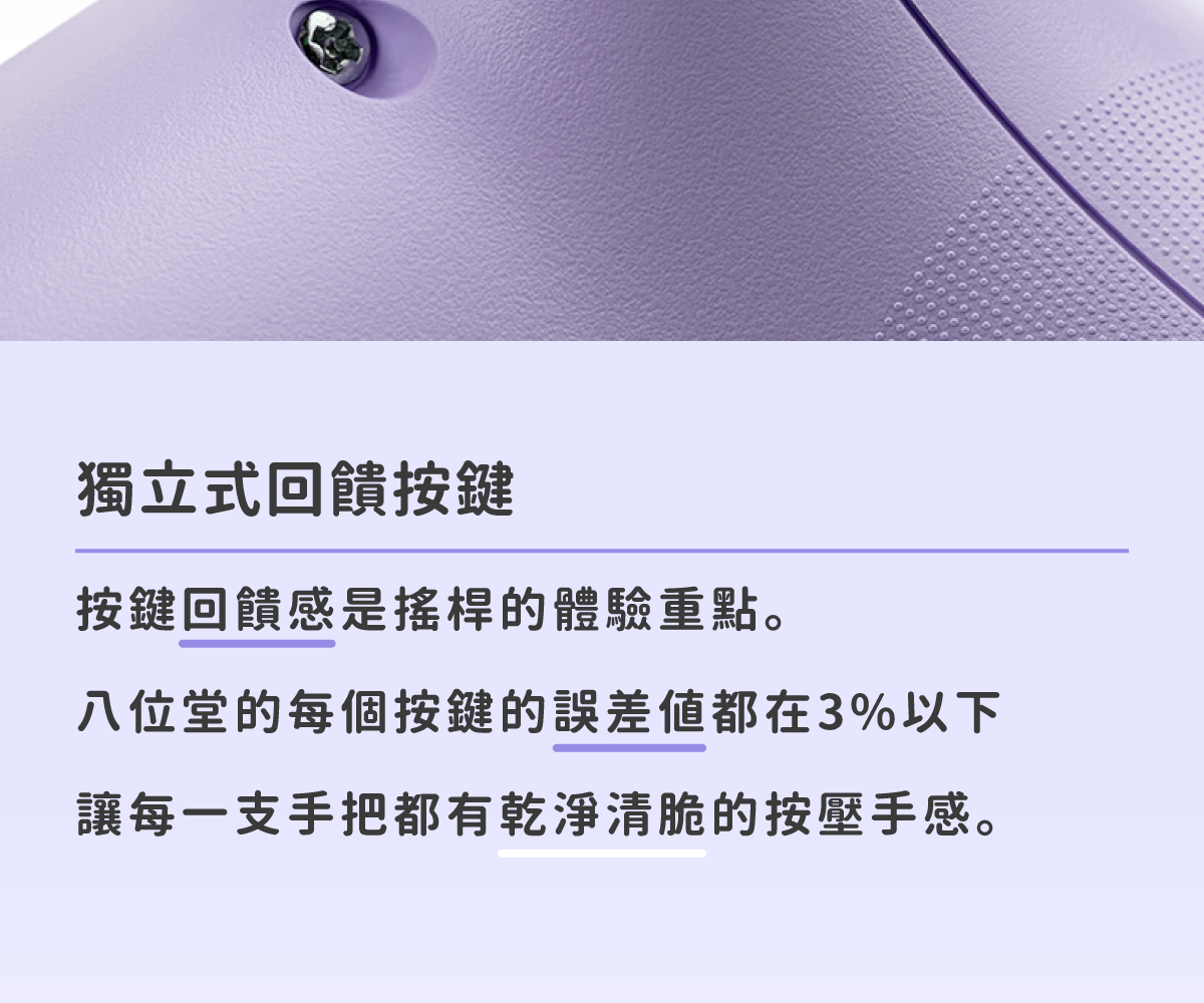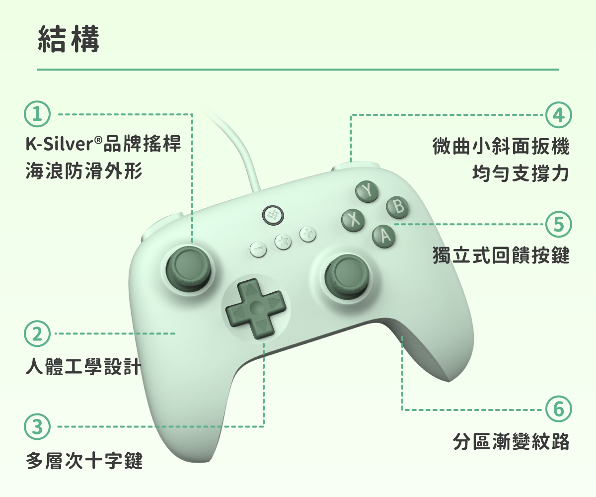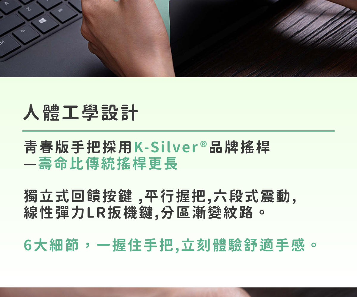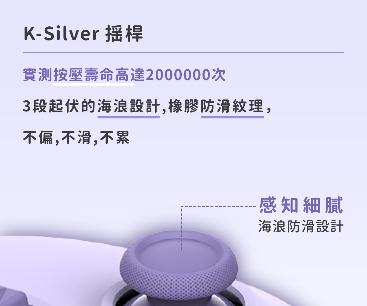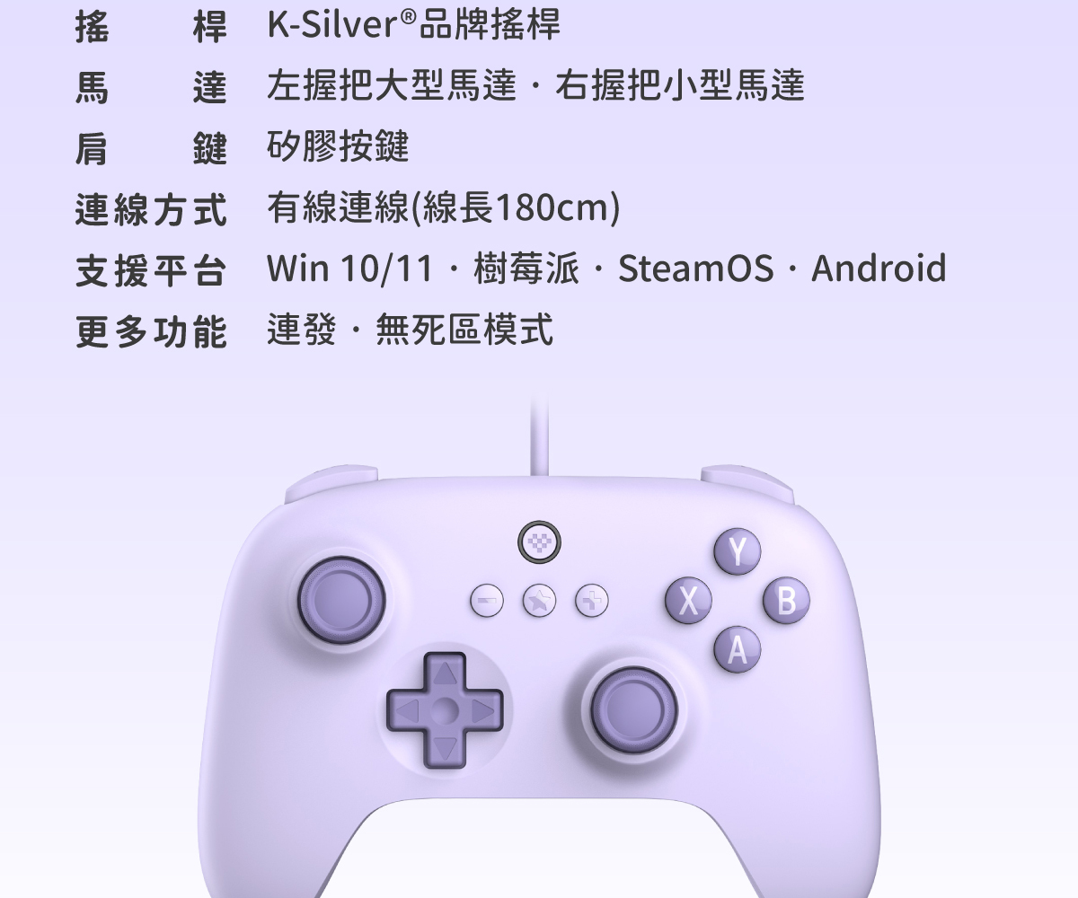 ● 250Hz 有線回報率、大小震動馬達、巧克力按感、K-Silver ®品牌搖桿漸變曬紋..等